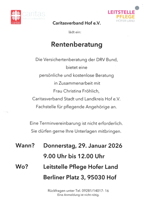 22. Januar 2026: persönliche und kostenlose Rentenberatung am 29.01.2026