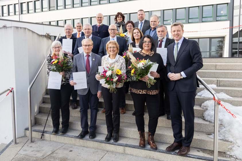 Erste Reihe v. l.: Gisela Falkenberg aus Schwarzenbach an der Saale, Reinhold Rittweg und Angela Wunner aus Schwarzenbach am Wald, Nadja Rudolph aus Zell im Fichtelgebirge und Landrat Dr. Oliver Bär; Zweite Reihe v. l.: Klaus Reithmeier, Manfred Lang und Oliver Münchberger aus Schwarzenbach an der Saale, Regina Hager aus Weißenstadt, Werner Kreil aus Zell im Fichtelgebirge; Dritte Reihe v. l.: Bürgermeister Karl-Philipp Ehrler aus Stammbach, Bürgermeister Hans-Peter Baumann aus Schwarzenbach an der Saale, Bürgermeister Horst Penzel aus Zell im Fichtelgebirge, Mitorganisatorin der Ehrung Sandra Leucht sowie Bürgermeister Reiner Feulner aus Schwarzenbach am Wald.